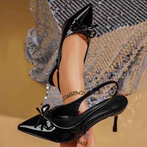 Women's Pointed Toe Slingback High Heels - 3.14 Inch Stiletto, Glossy Patent Leather with Bow Decor, Elegant Dress Shoes for Evening, Party & Formal Occasions